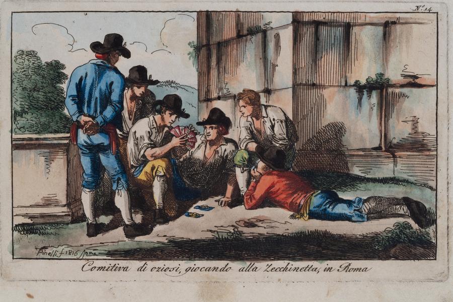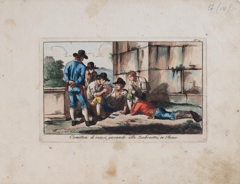 In the first version of the composition Comitiva di oziosi, giocando alla Zecchinetta, in Roma, which Bartolomeo Pinelli performed for the album Raccolta di Cinquanta Costumi Pittoreschi (Collection of Fifty Picturesque Costumes) published in 1809, the author paid special attention to the architectural background (the main thing for the artist was that the event took place in Rome). The players and spectators were depicted sitting and standing with their backs or sides turned to the viewers; without a caption text, it was unclear what they were doing. In the simplified version (without the Roman architectural background) presented in the Lviv collection, the main attention is paid to the players and the deck of cards. This etching painted with watercolours has been known since 1816. It was issued in the album Nuova Raccolta di Cinquanta Costumi Pittoreschi incisi di acqua forte (New Collection of Fifty Picturesque Costumes), published in Rome in 1817. This composition is from a series of Roman entertainments. In front of the brick wall are six young men captured by playing zecchinetta. The central character opened the deck of cards in a semicircle. The other characters sit, stand, and lie beside each other, looking intently at the deck of cards accentuated by pink stripes on a grey background. The composition is dynamic; the drawing is light and relaxed. The engraving is painted with watercolours, with prevailing dimmed grey, ocher, black, and accents of bright red, blue, green, and yellow.