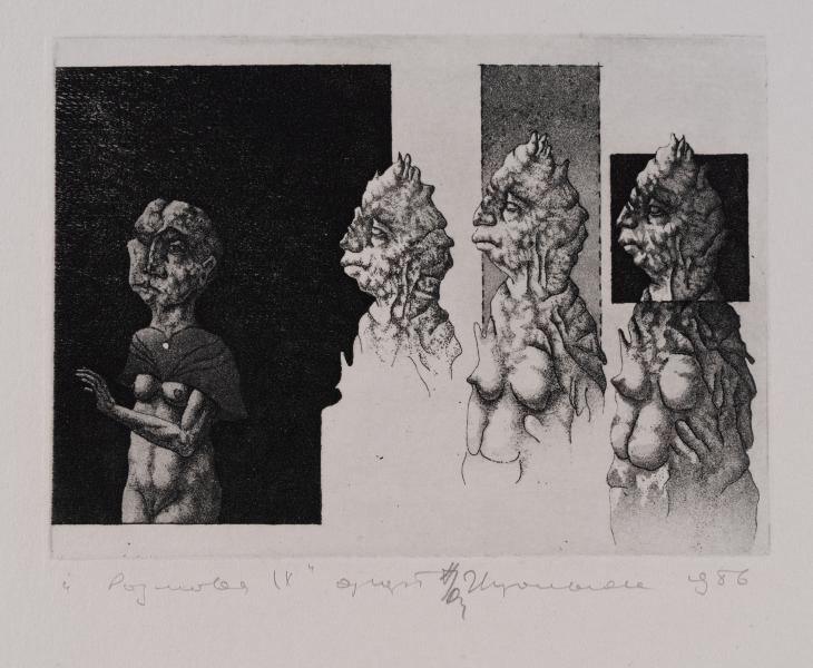 In their Gothic guise these sorts of grotesqueries represented human depravities given their apocalyptic form, that is to say their true form behind appearance, the revelation of otherwise hidden human sin as it will appear on the Judgement Day. Are Podolchak's visions in this fantastic space of repression likewise apocalyptic, though perhaps signalling a political dread of Orwellian nightmares becoming ecstatic?" (Edward Colless, "Essay". To the exhibition catalogue "Igor Podolchak. Ukrainian Printmaker", 1991).