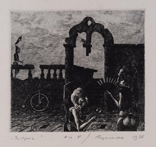 In their Gothic guise these sorts of grotesqueries represented human depravities given their apocalyptic form, that is to say their true form behind appearance, the revelation of otherwise hidden human sin as it will appear on the Judgement Day. Are Podolchak's visions in this fantastic space of repression likewise apocalyptic, though perhaps signalling a political dread of Orwellian nightmares becoming ecstatic?" (Edward Colless, "Essay". To the exhibition catalogue "Igor Podolchak. Ukrainian Printmaker", 1991).