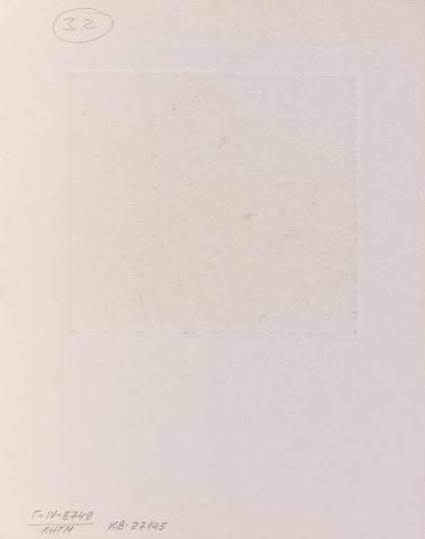In the foreground (print size – 11.7 х 12.7 cm), two men are portrayed, one sitting in a high-backed wheelchair. To the right of him is the second man, depicted in a semi-profile. In his left hand, he holds an open fan. The man has a high, rounded forehead and a long nose with a bump. He is dressed in a sleeveless waist-length shirt and wears a fez on his head. His trousers are revealing his buttocks, and a pistol is visible at his waist. In the background, the ruins of a castle are depicted: an arch, on the window lintel of which sits a crow, and a balustrade with partially missing balusters. Beyond the balustrade, a man in underwear is shown with a net in his hands. Below the balustrade is a two-wheeled bicycle.