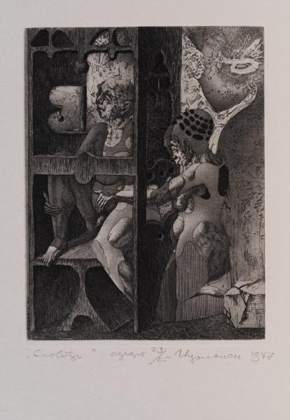 In their Gothic guise these sorts of grotesqueries represented human depravities given their apocalyptic form, that is to say their true form behind appearance, the revelation of otherwise hidden human sin as it will appear on the Judgement Day. Are Podolchak's visions in this fantastic space of repression likewise apocalyptic, though perhaps signalling a political dread of Orwellian nightmares becoming ecstatic?" (Edward Colless, "Essay". To the exhibition catalogue "Igor Podolchak. Ukrainian Printmaker", 1991).