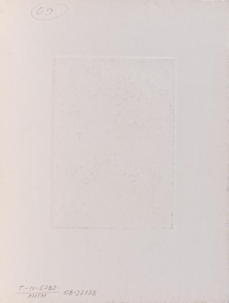 A deformed headless figure with female features stands on the crumbling base (print size – 14.1 х 10 cm). Her body is depicted in a three-quarter turn to the right. A belt is attached to the buttocks, leaving the lower abdomen exposed. The woman's left foot is placed in a vertical pedestal element, similar to a pipe. The woman holds a horse's leg by the hoof with her right hand. On the left side of the pedestal, there is a sword with a vertical hilt.