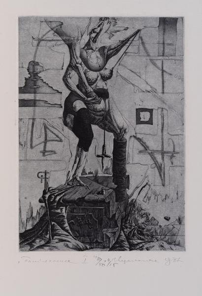 In their Gothic guise these sorts of grotesqueries represented human depravities given their apocalyptic form, that is to say their true form behind appearance, the revelation of otherwise hidden human sin as it will appear on the Judgement Day. Are Podolchak's visions in this fantastic space of repression likewise apocalyptic, though perhaps signalling a political dread of Orwellian nightmares becoming ecstatic?" (Edward Colless, "Essay". To the exhibition catalogue "Igor Podolchak. Ukrainian Printmaker", 1991).