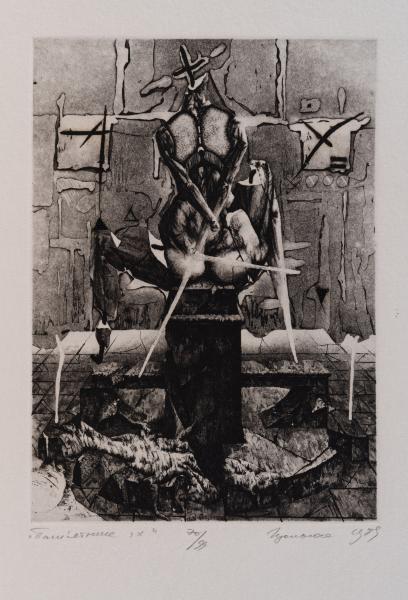 In their Gothic guise these sorts of grotesqueries represented human depravities given their apocalyptic form, that is to say their true form behind appearance, the revelation of otherwise hidden human sin as it will appear on the Judgement Day. Are Podolchak's visions in this fantastic space of repression likewise apocalyptic, though perhaps signalling a political dread of Orwellian nightmares becoming ecstatic?" (Edward Colless, "Essay". To the exhibition catalogue "Igor Podolchak. Ukrainian Printmaker", 1991).