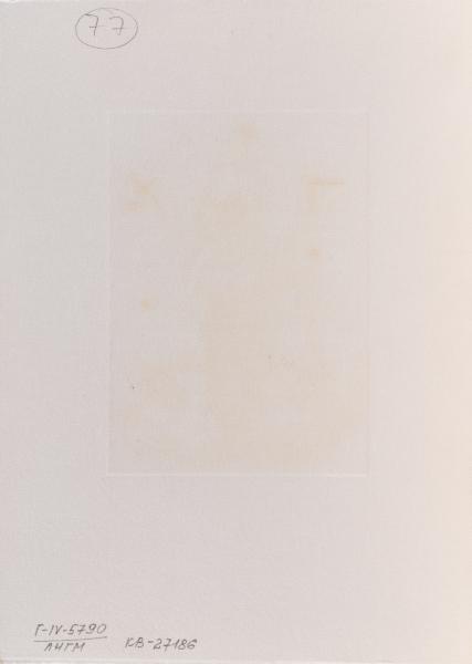 The work is a monochrome black and white print (13.9 х 9.9 cm). At the centre of the composition is a parallelepipedal pedestal on a cracked square tiled floor. On it is the naked torso of a headless man seated with his back to the viewer. The legs are not fully visible but are spread apart. The arms, without hands, are crossed behind the back. Behind the pedestal on the floor is a damaged bench. In front of the pedestal is something broken and homogeneous with the bench and a shapeless light element on the left. In the background is a stained curtain with black cross-shaped triangular marks. A thin black cross replaces the missing head.