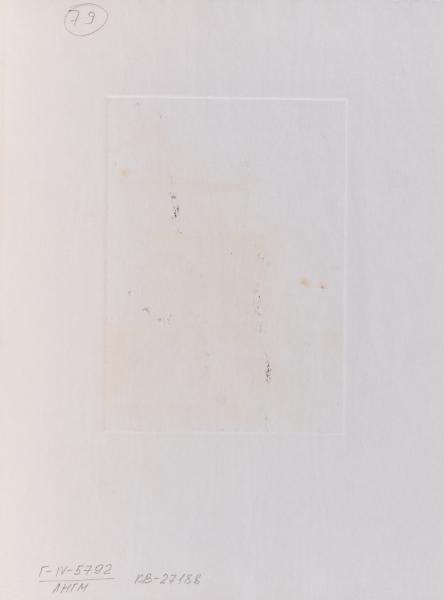 The work is a monochrome black and white print (14 х 10 cm). The centre of the composition is a complex damaged pedestal on a slab that has two steps. It supports a cube with three narrow buttresses at the front edge of the cube. The buttresses are pierced vertically by three light poles. On the pedestal is a naked man with a bald head, tilted horizontally, who is turned in profile towards the observer. Legs – calves with feet – protrude from the left side of the cube of the pedestal. A thin slab is parallel to the top of the cube. The left edge of this slab points towards a vertical light pole embedded in the cube. The right front corner of the slab is supported by a long vertical light pole, which rests on the lower end of the pedestal. The torso of a naked man 'emerges' from the top of the cube and 'passes' through the top panel. The man's face is turned upwards, and his left hand is lowered freely through the slab. The background of the composition is a mottled light surface with intersecting straight grey lines.