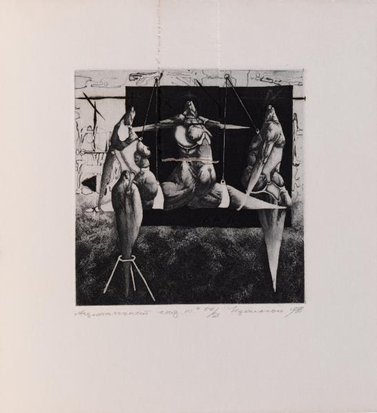 In their Gothic guise these sorts of grotesqueries represented human depravities given their apocalyptic form, that is to say their true form behind appearance, the revelation of otherwise hidden human sin as it will appear on the Judgement Day. Are Podolchak's visions in this fantastic space of repression likewise apocalyptic, though perhaps signalling a political dread of Orwellian nightmares becoming ecstatic?" (Edward Colless, "Essay". To the exhibition catalogue "Igor Podolchak. Ukrainian Printmaker", 1991).