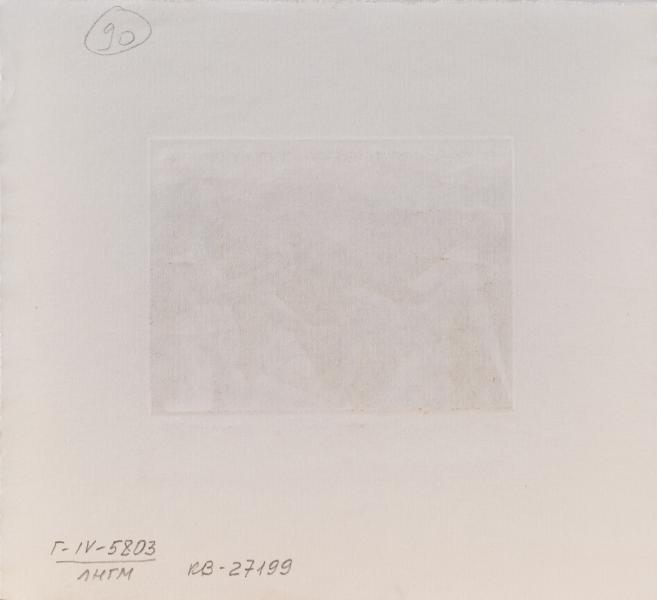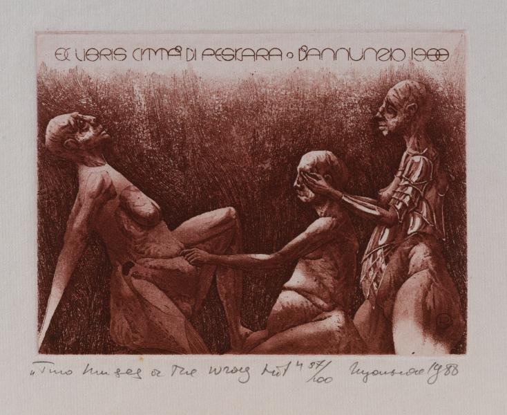 On a dark brown background (print size – 7.4 х 9.8 cm) is a generational image of three people touching each other one after the other. The nude woman on the right, shown in profile, has a large belly and touches the eyes of the second person, shown in profile to the left, with the palm of her hand. The second person is seated and touches the stomach of the woman shown in profile on the left, with her hand outstretched in front of her. A brown inscription is at the top of the print: "EX LIBRIS CITTA DI PESCARA DANNUNCIO 1988".
