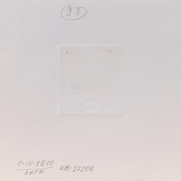 The work is a monochrome black and white print (5.4 х 4.8 cm). The front vertical plane of the base is decorated with white embossed dots arranged in a generally square shape. On the vertical plane, part of a naked man is depicted in a ⅔ reverse to the right. His right knee rests on a pedestal. His left leg, fully bent at the knee, hangs out to the side. The torso is bent forward and is shown below the shoulders, with the right hand behind the back. There is a black spot where the head should be bowed. The background of the composition is light grey at the bottom and dark grey at the top. Light spots and black outlines are scattered throughout the background.