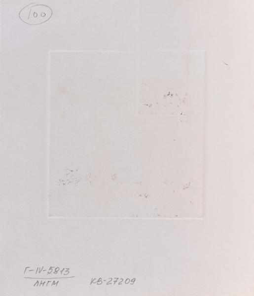 The monochrome black and white print (9.8 x 9.2 cm) is reproduced on a sheet of paper to which a vertical strip of the same paper (7 x 3 cm) has been glued at the top left. The print shows an old nude woman in a composition with architectural structures. She is seated in profile on a prismatic and narrow stone pedestal. The woman's head has a large nose, and her legs are raised horizontally. Her left arm is lowered, the palm of her hand resting on her stomach. Her feet are stuck in a low cylindrical stone column on a lower plinth. It is completed by a pyramid on a low prism. The cylindrical column under the prism is supported by horizontal stone slats which run from the left to the right edge of the print at the height of the woman's neck. The background of the composition is dark grey at the bottom and light grey at the top. There are lighter vertical dots with black outlines. On the left, below the top edge of the print, there are two paired black triangles. To the right is a black outline resembling a five-pointed star with a horizontal "tail" curve.