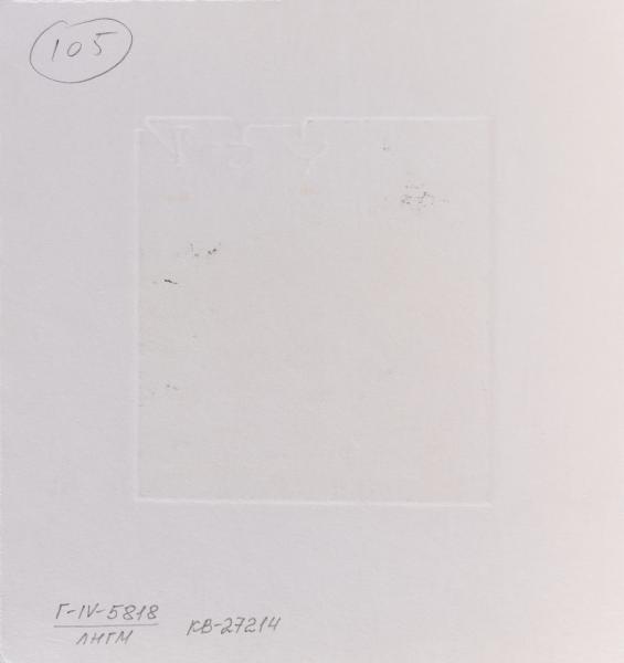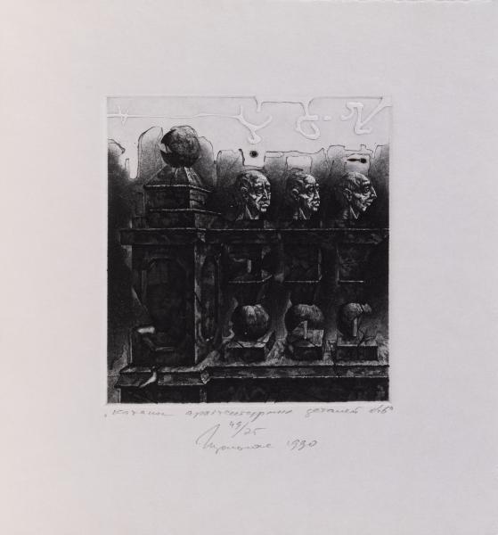 The work is a monochrome black and white composition (9.9 x 9.2 cm) with white embossing under the top edge of the print. Almost the entire work surface is taken up by the image of the outermost part of a stone balustrade with a massive final supporting pillar on the left. It is made up of six geometric elements arranged one above the other: at the bottom, a high tetrahedral prism with shallow octagonal niches; above it, two tetrahedral plates and a low prism, stacked in a stepped pyramid; the lower plate becomes a horizontal plate – the balustrade railing; the upper prism ends in a pyramid on which a large ball is impaled. Below the balustrade are three small columns made up of elements in the shape of a prism, a sphere, a pyramid and a cube. On the balustrade above each small column are three bald male heads: the first on the left, ⅓ turned to the right; the middle one, ⅔ turned to the right; the third in profile to the right. The background of the composition, dark grey at the bottom and light grey at the top, is divided by a thin, curved black line. There are three small black circles above the first and third heads.