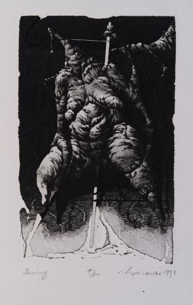 In their Gothic guise these sorts of grotesqueries represented human depravities given their apocalyptic form, that is to say their true form behind appearance, the revelation of otherwise hidden human sin as it will appear on the Judgement Day. Are Podolchak's visions in this fantastic space of repression likewise apocalyptic, though perhaps signalling a political dread of Orwellian nightmares becoming ecstatic?" (Edward Colless, "Essay". To the exhibition catalogue "Igor Podolchak. Ukrainian Printmaker", 1991).