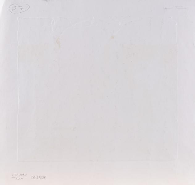 The work is a monochrome black and white print (29.7 х 32.9 cm) with white embossing at the top. At the centre of the composition, on a chipped stone podium with six consoles, is a heap of amorphous mass vaguely resembling a human body – the upper part appears to be a torso in a white sleeveless shirt. This mass is pierced by a straight, light grey rod. On the right, a similar but curved rod surrounds the mass. On the left, a straight bar supports the torso with its upper end and rests on the stone surface with its lower end. To the right of the mass on the podium are two low four-sided columns with pyramidal surfaces. Behind the podium is a vertical surface with a wallpaper pattern in the form of large rings formed by small rings. At the top of the print, the "wallpaper" is bordered by a black horizontal stripe. The central part of this stripe has a light grey overlay and merges with the upper stripe of the design, which has a white embossing. The left part of the black stripe depicts a man's bald head; the right part depicts an older woman's head; the white inlay depicts a man's bald head.