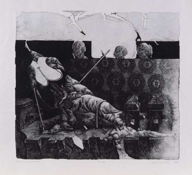 In their Gothic guise these sorts of grotesqueries represented human depravities given their apocalyptic form, that is to say their true form behind appearance, the revelation of otherwise hidden human sin as it will appear on the Judgement Day. Are Podolchak's visions in this fantastic space of repression likewise apocalyptic, though perhaps signalling a political dread of Orwellian nightmares becoming ecstatic?" (Edward Colless, "Essay". To the exhibition catalogue "Igor Podolchak. Ukrainian Printmaker", 1991).