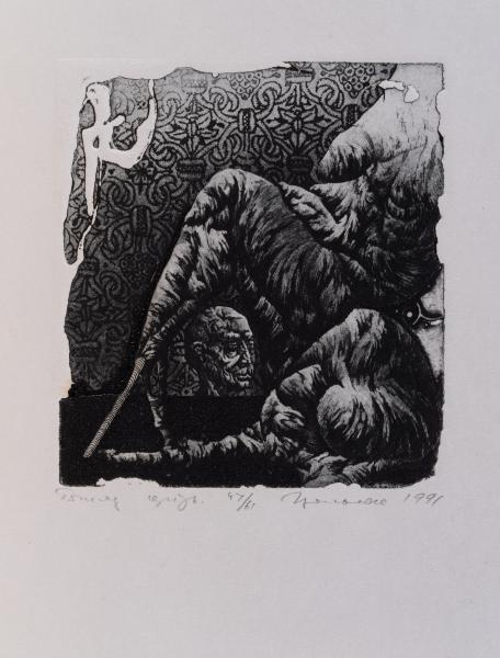 In their Gothic guise these sorts of grotesqueries represented human depravities given their apocalyptic form, that is to say their true form behind appearance, the revelation of otherwise hidden human sin as it will appear on the Judgement Day. Are Podolchak's visions in this fantastic space of repression likewise apocalyptic, though perhaps signalling a political dread of Orwellian nightmares becoming ecstatic?" (Edward Colless, "Essay". To the exhibition catalogue "Igor Podolchak. Ukrainian Printmaker", 1991).