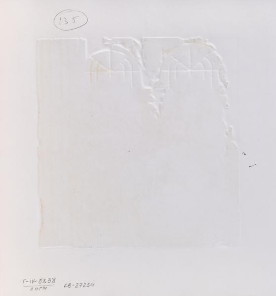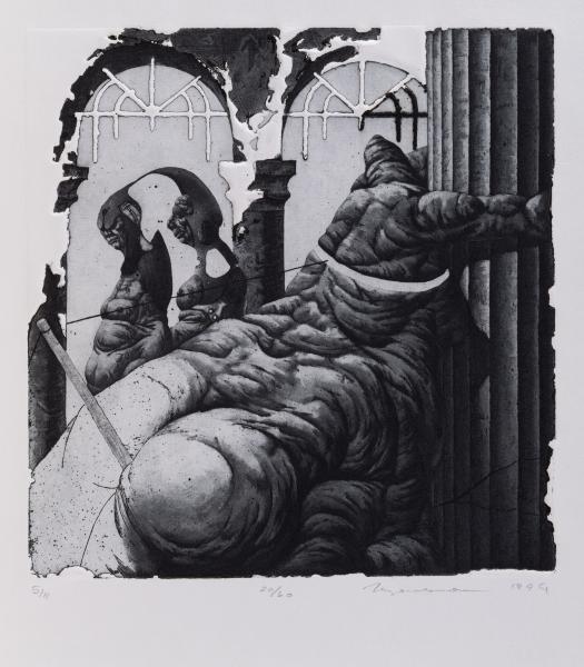 The work is a monochrome black and white print (20.3 х 19.3 cm) with white embossing at the top left. In the foreground is a grey, amorphous mass resembling a human body. However, the body is distorted: the lower part, facing the viewer, has huge knees; the upper part, seen from behind, has its arms wrapped around a column with cannulas. The torso is wrapped in a white belt connected by a black straight line to a stick protruding between the knees. Behind this humanoid mass, two naked women are depicted in the background on the left, connected by grey and white spots. On a light grey background is an arcade of two arches with lattice-like openings (white on the left and white and black on the right). Two round columns with a simple horizontally profiled capital support the arches.