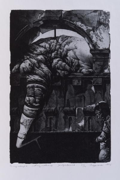In their Gothic guise these sorts of grotesqueries represented human depravities given their apocalyptic form, that is to say their true form behind appearance, the revelation of otherwise hidden human sin as it will appear on the Judgement Day. Are Podolchak's visions in this fantastic space of repression likewise apocalyptic, though perhaps signalling a political dread of Orwellian nightmares becoming ecstatic?" (Edward Colless, "Essay". To the exhibition catalogue "Igor Podolchak. Ukrainian Printmaker", 1991).