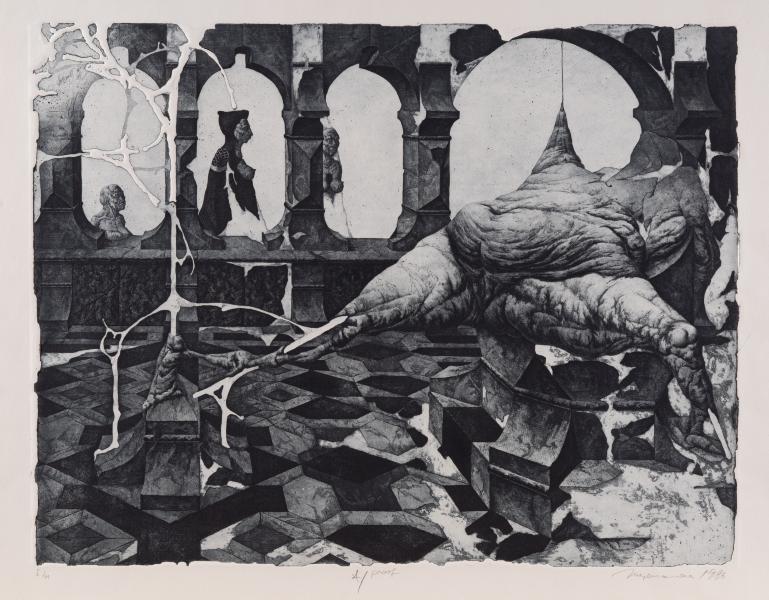 In their Gothic guise these sorts of grotesqueries represented human depravities given their apocalyptic form, that is to say their true form behind appearance, the revelation of otherwise hidden human sin as it will appear on the Judgement Day. Are Podolchak's visions in this fantastic space of repression likewise apocalyptic, though perhaps signalling a political dread of Orwellian nightmares becoming ecstatic?" (Edward Colless, "Essay". To the exhibition catalogue "Igor Podolchak. Ukrainian Printmaker", 1991).