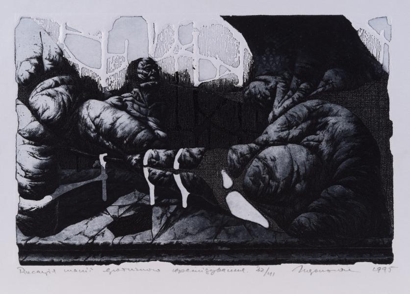 In their Gothic guise these sorts of grotesqueries represented human depravities given their apocalyptic form, that is to say their true form behind appearance, the revelation of otherwise hidden human sin as it will appear on the Judgement Day. Are Podolchak's visions in this fantastic space of repression likewise apocalyptic, though perhaps signalling a political dread of Orwellian nightmares becoming ecstatic?" (Edward Colless, "Essay". To the exhibition catalogue "Igor Podolchak. Ukrainian Printmaker", 1991).