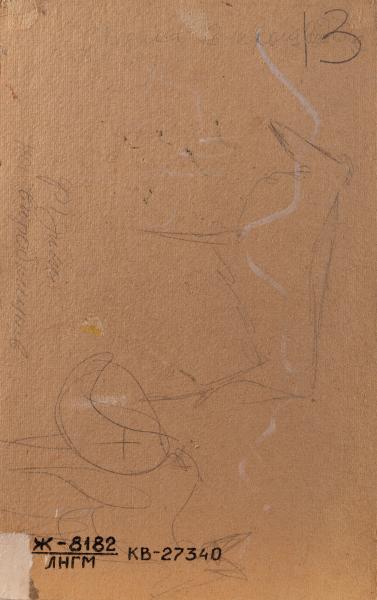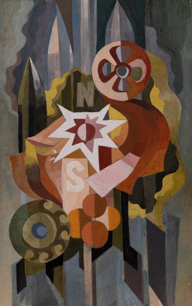 The specificity of this sketch lies in the combination of images related to the practical application of nuclear energy and the discoveries of the first half of the 20th century during the Cold War. Timelessness is indicated by a generalised space and is complemented by the standard symbolic designations of the cardinal points – North (N) and South (S). The central part of the composition probably depicts a symbolic representation of an explosion and a "new sun" against a background of strategic nuclear weapons (it is almost impossible to identify whether it is, for example, an R-17 (index 8K14) or an R-21 (GRAU index 4K55), due to the peculiarities of the stylisation). The central image is complemented by elements, the upper one resembling a film or magnetic tape reel (from which strips seem to emerge) and the lower one a rolling mill or, more likely, given the context, the structure of a nuclear reactor unit. In general, the colouring is mixed and somewhat unsettling, and the approach to stylisation is decorative.