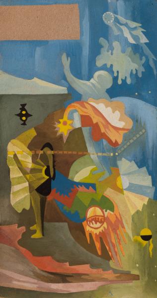 The sketch is probably intended for the same architectural space as Ж-8181 and Ж-8183. An unpainted rectangular space on the left could indicate either a door or a door frame. The specificity of the image interpretation and the saturation of the individual images, which are stylised decoratively, do not allow us to identify the affiliation of the objects in detail. However, this suggests that the author captured images of space exploration inspired by textual and visual works. In this context, we mean the influence of films, cinematography and special effects by Pavlo Klushantsev. Firstly, the movie "Planet of the Storms" (1961) and its echoes, especially in Stanley Kubrick's popular science fiction film "2001: A Space Odyssey" (1968) (based on Arthur C. Clarke's novel), which was shown in the USSR at the VI International Film Festival in Moscow in 1969. The imagery developed by the artist is rich in colour and formal and emotional dimensions. Contrasting colour schemes and tonal accents, the use of imitations of falling objects resembling meteorites, unearthly landscapes and skylines, and the manipulations carried out by specialists in a state of weightlessness, which may be of a research nature, all reflect cinematic moments but can also be part of a dreamlike fantasy about the future of space.