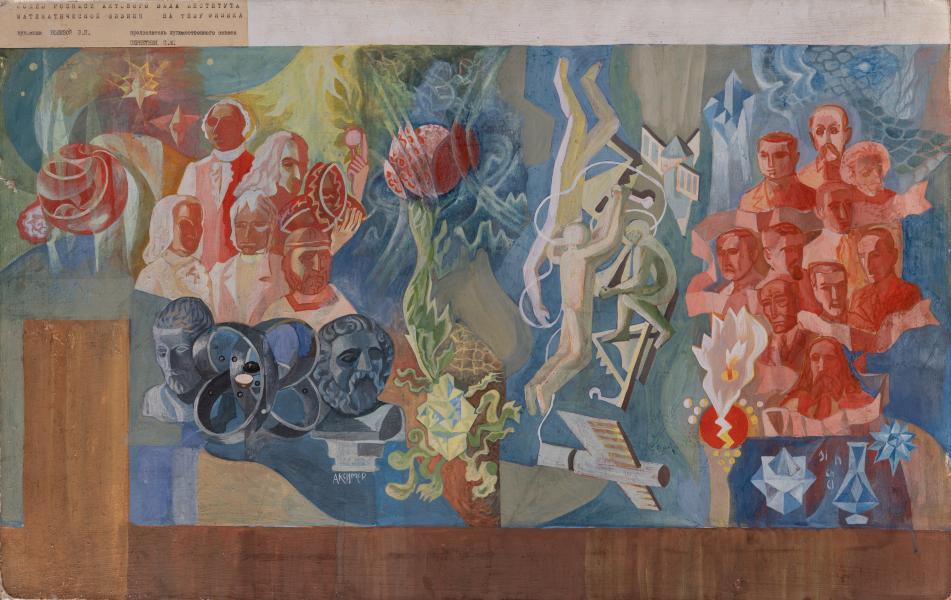The work is a sketch of a monumental thematic and symbolic mural on the theme of natural and social sciences in two groups of stylised portraits in red. On the right are stylised busts of Taras Shevchenko, Serhii Koroliov, Albert Einstein, Ernest Rutherford, Ihor Kurchatov, and Dmytro Likhachov. Mikhailo Lomonosov, Isaac Newton, Michael Faraday, and currently unidentified figures are on the left. Below the left group are two antique busts painted in blue. They are probably busts of Democritus and Archimedes. In addition to the portraits, there are several groups of symbolic representations of the development of the natural sciences, both physics and chemistry. In particular, there are stylised models of the structure of the atom with markings of the achievements of space research and rocketry, symbolising the progressive development of scientific and technical knowledge and understanding of the universe. The overall composition is based on a mixed colour scheme with cold blues, greens, and some colour and tone accents. Although the label in the upper left corner (written on a typewriter, probably "Moscow", in a typified Cyrillic script) states that the work was intended for the assembly hall of the Institute of Mathematical Physics, such an institution did not exist at the time, so it can be assumed that it was a national research institute of a physics orientation.