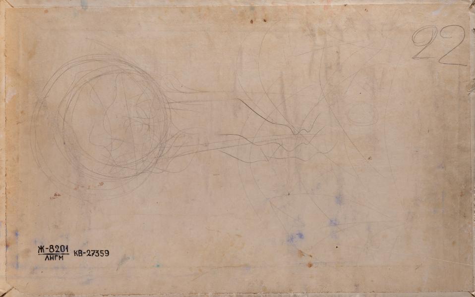 In the upper left corner is an inscription made on a typewriter and glued to cardboard (in russian): "Sketch of a mural of the assembly hall of the Institute of Mathematical Physics on the theme of physics / by Artist Poliovyi V. P., chairman of the artistic council Servetnyk S. M.".