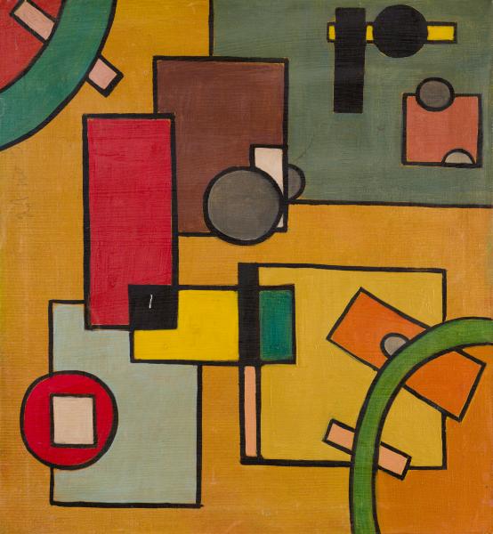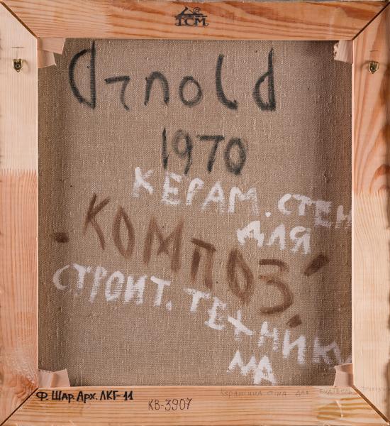 According to the author's signature on the back of the work, the composition is a variation on the subject of a real object or a proposal for the solution of the ceramic wall of the construction college. However, further information about this work has yet to be found. Nevertheless, from the point of view of its formal solution, this painting by Arnold Sharhorodskyi is in line with the practices of Soviet artists who developed this type of abstraction (for example, the "Signal System" series of 1957–1962 by Yurii Zlotnikov (1930–2016). Related motifs are undoubtedly known in the works by the avant-garde artists, in particular the Suprematists, the Bauhaus School and many abstract painters, which generally makes it difficult to establish the exact source of inspiration but allows us to claim that Arnold Sharhorodskyi in his practices of the 1970s explored the visual language of other artists in order to develop his own. In fact, in this composition, we can find an expressive search for harmony of two-dimensional geometric forms on the plane and a detailed development of colour and tonal solution. It should be emphasised that the author generally creates spatiality and extraordinary dynamic spectacularity in this way, where there are no sharp contrasts, warm parts balance cold ones, and achromatic accents complement polychrome. It is also worth noting that the symbolic form developed by the artist also has an undeniable connection with the architectural and construction context and, to some extent, contains an echo of cartographic planning.