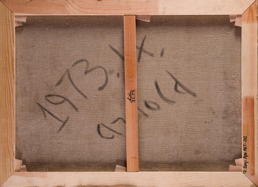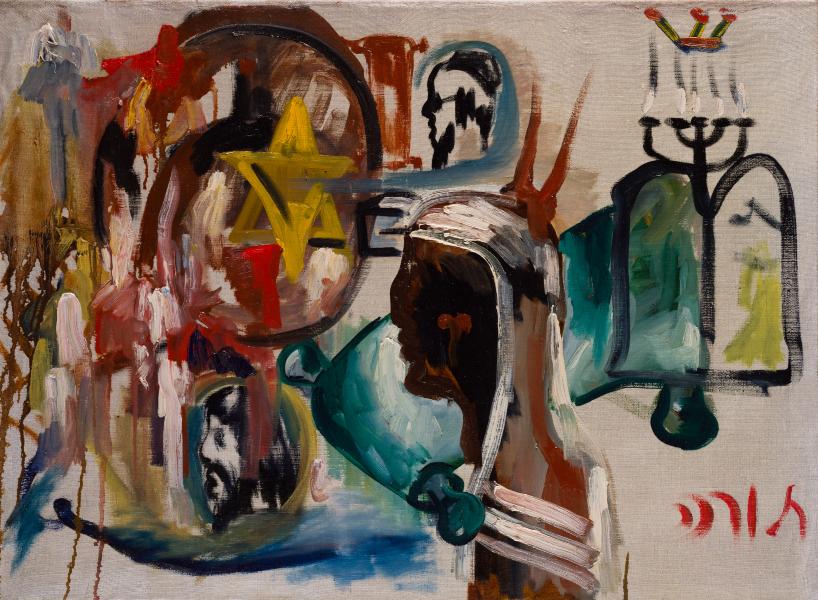 The work was created in the same period as the thematically religious and symbolic "Composition with Candles" (August 1973, inv. number "Ф.Шар.Арх. ЛКГ-12") and "Composition with a Profile" (October 1974, inv. no. "Ф.Шар.Арх.ЛКГ-24"), which belong to "kabbalistic things" (author's definition). However, the language used by the author in this work is undoubtedly emotional, following the practices of Abstract Expressionism, although the motifs used are consonant – from the 21 letters of the Hebrew alphabet שׂ (but the inscription on the work lacks a dot), which is placed above a candelabrum similar to a menorah, but it is designed for five candles (in the right part of the composition). Next to a stylised figure (the prophet Moses?) is the image of a greenish-white scroll on a wooden roll with handles but no inscriptions. It is worth noting that this scroll seems to be a continuation of the two tablets (Luchot habit), which have only one letter similar to ג (gimel), which has been interpreted as reward and punishment, and in particular that a person is free to choose between good and evil. Other texts have an inscription in the lower right corner, immediately below the tablets, in red colour, which is unclear and complicated to determine whether it is גוהר. The left part of the composition is a layer of expressively resolved motifs, including two male profiles. The upper male profile is interpreted linearly; the figure has a beard but no moustache and probably wears thin-rimmed glasses and a velvet kippah with four wedges (Haredi) on the back of his head. The man's gaze is directed towards the scroll with no inscriptions, beside which is a massive linear image of the Star of David (Magen David) in bright yellow paint. Below the image of Magen David is a man's profile, also linearly stylised. This figure has a medium-length beard, moustache, and long black hair that partially covers his neck. There are apparently chaotic lines in front of the man, which could be signs of light spiritual beings. In general, in the absence of the author's interpretation of the plot and any clarifications that could guide the search for deciphering the content, we can say that the work is probably intended for individual perception and a certain freedom of interpretation. In any case, this work by Arnold Sharhorodskyi is one of those exceptional mystical paintings resulting from a personal spiritual quest.
