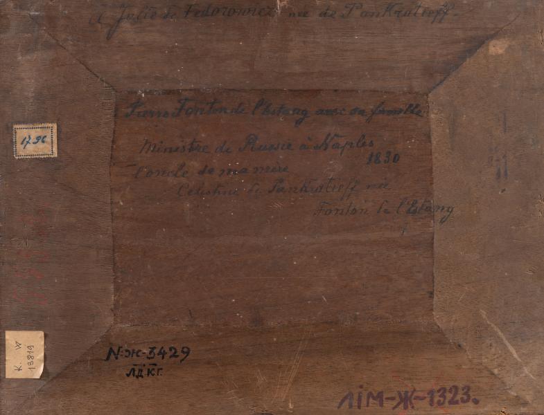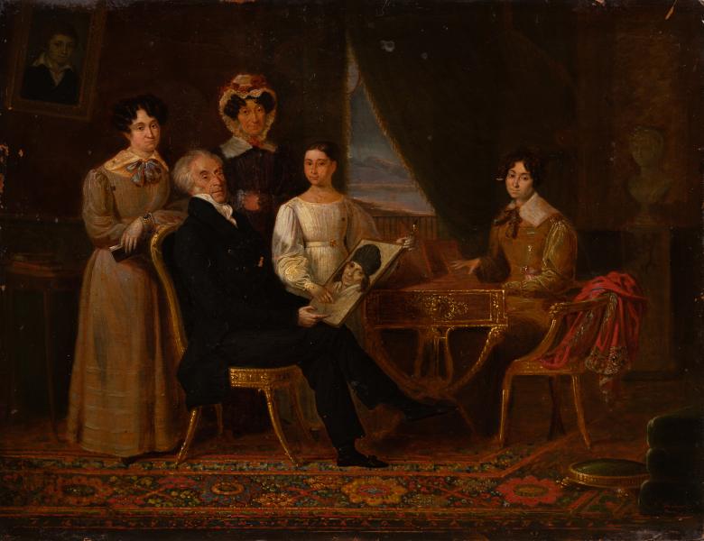In the luxuriously furnished room, against the backdrop of an open window, half-covered by a curtain, the artist placed family members of the gentleman Pierre Fonton de L'Estaing. The head of the family, a grey-haired, imposing man, is placed in the centre of the room. He is seated in an armchair, resting one leg on the other, and looks at the viewer with a friendly gaze. Behind him stands his elderly wife, a dignified lady in a white lace cap with a red ribbon. Behind the back of the chair is his eldest daughter in a beige dress. She is depicted full-length and holds a book. The youngest daughter, whose hair is neatly combed, wears a white dress and stands to the left of her father. She holds a brush and hands her father a newly painted portrait of a man. Opposite the older man, the middle daughter sits with one hand on the clavichord, decorated with an image of a lyre and gilded floral and ornamental decorations. An embroidered red cloak is draped over the back of her chair. An unmistakable family resemblance unites all the figures. The girls' occupations, the books, and the works of art that decorate the room represent the system of Enlightenment values and ideals shared by the noble family members.