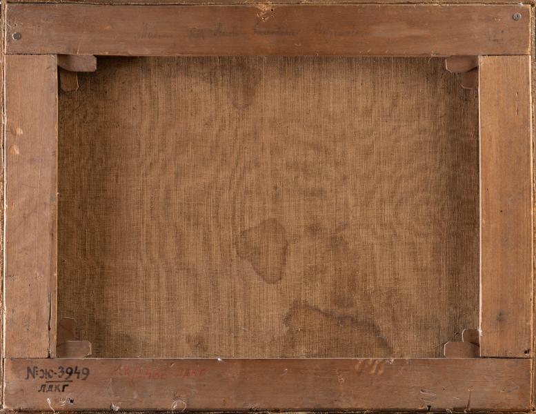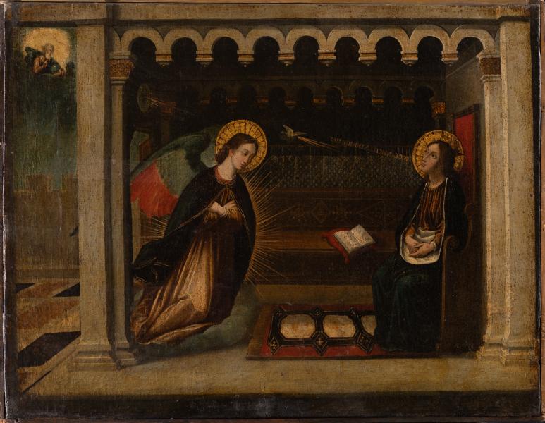 The "Annunciation" painting is one of many copies of a 14th-century fresco by Jacopo Pontormo (1494–1557), the original of which is preserved in the Church of Santissima Annunziata (Italian: La basilica della Santissima Annunziata) in Florence. Such copies were created in 1580 by Alessandro Allori (1535–1607) on wood, canvas, or copper. The scene is recreated in an open portico adorned with columns and pilasters. Near the back wall of the portico is an ornamented bench, on which is a red cushion with tassels and an open book. On the right, seated on a wooden throne, is the Virgin Mary in ochre-brown attire and a green-blue cloak. Her hands are folded on her lap, and there is a carpet beneath her feet. In the upper left corner of the composition, amidst the clouds, is a depiction of the Lord in bust-length, surrounded by a radiant glow. He blesses the earth, which he holds in his left hand. Rays from his radiance pass through the round window of the portico. Together with the white dove, representing the Holy Spirit, they illuminate the Virgin Mary's face. The inscription between the Holy Spirit and the Virgin Mary says: "ECCE ANCILLA DOMINI FIAT" – "Behold the handmaiden of the Lord". The inscription is depicted in reverse order. On the left, the Archangel Gabriel enters through the open doors with his hands folded on his chest. His garments are also in ochre tones. He has a dark green cloak draped over his shoulders, and his wings are green and red. Beneath the Archangel's feet are green-blue clouds, and rays of light surround his figure. The heads of the Archangel and the Virgin Mary are crowned with halos. In some versions of this copy, the artists depicted the inscription within the book itself.