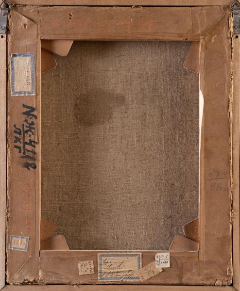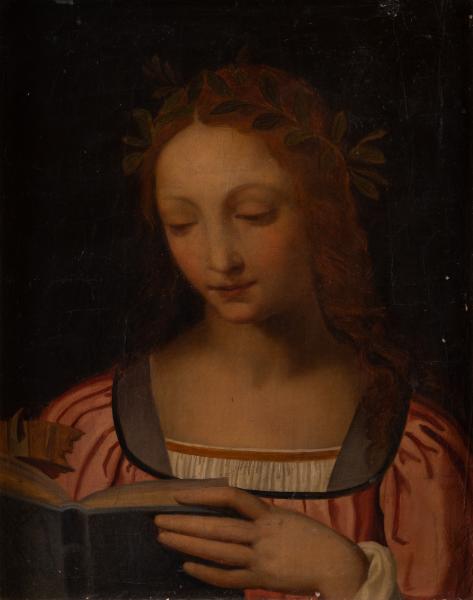 Against a dark background is a bust-length depiction of a young woman. Her torso is shown in a frontal view, and her head is turned slightly to the left and tilted. A laurel wreath is depicted on her flowing, wavy red hair. The woman's gaze is directed downward towards the book she supports with her left hand. Above the book, a piece of a wooden wheel with an iron spoke is visible in the lower-left corner. This theme was prevalent, as evidenced by numerous versions, replicas, and copies. Given the depiction of the laurel wreath and the book, the figure in this painting can be interpreted as an allegory of poetry. However, the palm leaves in the original painting could also indicate the depiction of a saint. The palm branch has been replaced with a wheel featuring an iron spoke in the presented copy. Given these iconographic elements, it can be asserted that this painting depicts Saint Catherine