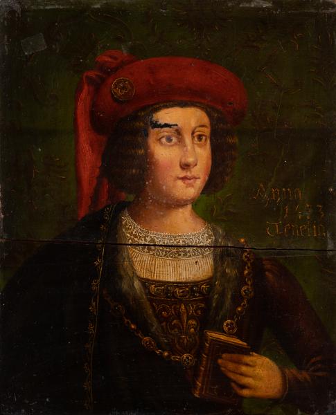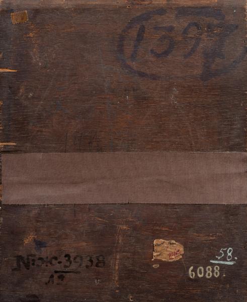 On the one hand, the Venetian School of Painting developed under the influence of strict Byzantine canons and, on the other, through the impact of Italian schools, primarily the Roman and Tuscan Schools. A characteristic feature of the Venetian School was the predominance and dominance of colour over form. It was in the 1470s that Venetian artists began to master the new technique of oil painting on wood and later on canvas. In Venice, this technique spread rapidly due to the durability of oil paints (compared to tempera) in conditions of constant humidity. One of the first to paint with oil paints was Giovanni Bellini (1430–1516), the founder of the Venetian School of Painting. The background of the painting is green, decorated with a golden animal and plant motif. The work is a bust-length portrait of a young man, depicted frontally with his face turned three-quarters to the right. The beardless young man with wavy dark hair is shown wearing a dark red beret adorned with a brooch on the left side and a trailing sash that falls down his back. His clothing is embroidered with gold and adorned with precious stones, trimmed with fur. A gold chain is depicted on his chest. A dark cloak is draped over his right shoulder. In his left hand, the young man holds a book.