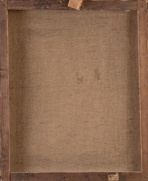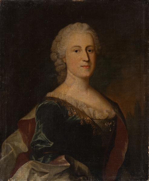 Against a dark background, a bust-length depiction of an unknown woman turned three-quarters to the right, wearing a white wig, is displayed. The subject is depicted with a confident gaze directed at the viewer, indicating that this is a portrait of a noblewoman in luxurious attire.