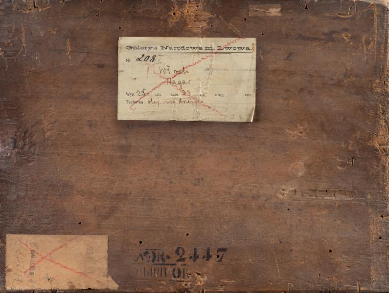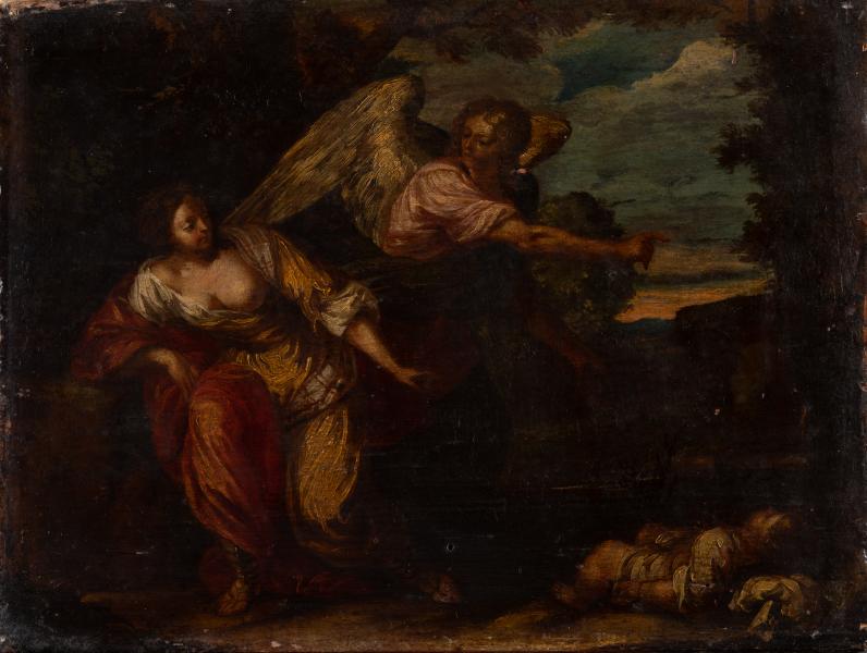 The artist depicted the widely known Old Testament story "The Angel Saves Hagar and Ishmael in the Desert". He was referenced by renowned masters such as Simone Cantarini, Guercino, Sebastiano Ricci, and Claude Lorrain. Hagar was the servant of Abraham and the mother of his firstborn, Ishmael. Abraham is the first of the great patriarchs of the Old Testament, the progenitor of the chosen people, revered by Jews, Christians, and Muslims. Abraham, the son of Terah, came from the Chaldees city of Ur in Mesopotamia, where he married his sister Sarah. Obeying the command of the Lord, he left Ur and, along with his wife, father, and nephew Lot, arrived in Canaan, where he became influential and wealthy. The only thing that troubled the couple was the lack of an heir. Therefore, Sarah gave Abraham her maid, the Egyptian Hagar, who soon bore him a son, Ishmael, who, according to Jewish law, was considered the official son and heir of Sarah and Abraham. Fourteen years passed. Three angels announced to the patriarch and Sarah the birth of a son. Indeed, ninety-year-old Sarah, who considered herself barren, gave birth to Isaac. Sarah did not want her only son to share the inheritance with the son of the maid, so she forced Abraham to cast them out of the house. With pain and a sense of guilt, Abraham complied, rising early in the morning, taking bread and a waterskin, giving them to Hagar, and sending the woman away with her son. They wandered in the desert. When they ran out of bread and water, she placed her son under a bush and went away to avoid seeing him die, but the boy cried. God heard him and sent an angel who showed them a well of water and commanded: "Up! Lift up the boy and hold him fast with your hand, for I will make him into a great nation" (Genesis 21:18). Ishmael became the progenitor of the warlike tribe of archers known as the Ishmaelites or Saracens ("sons of Sarah"), who inhabited the Arabian Peninsula. It is this moment that is depicted in the painting. In the centre is an angel turned to the right with outstretched wings, energetically pointing at the well behind him with his right hand. The left part of the painting is occupied by the figure of Hagar, dressed in traditional Baroque attire – lavish, golden-orange garments adorned with embroidery. The exhausted woman, kneeling on one knee, points to the figure of the boy, who lies motionless under the bush.