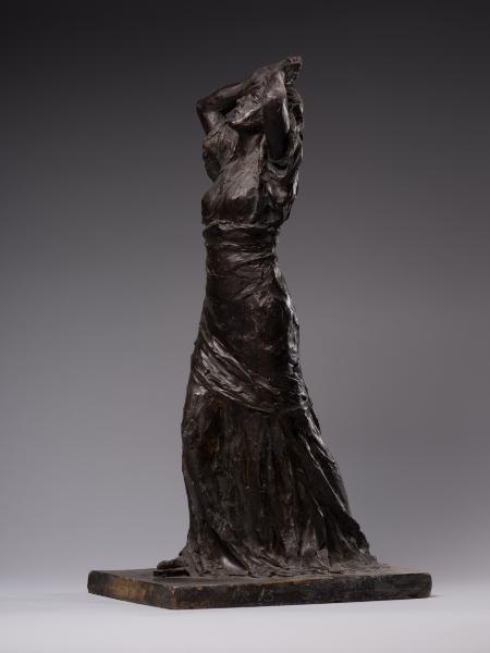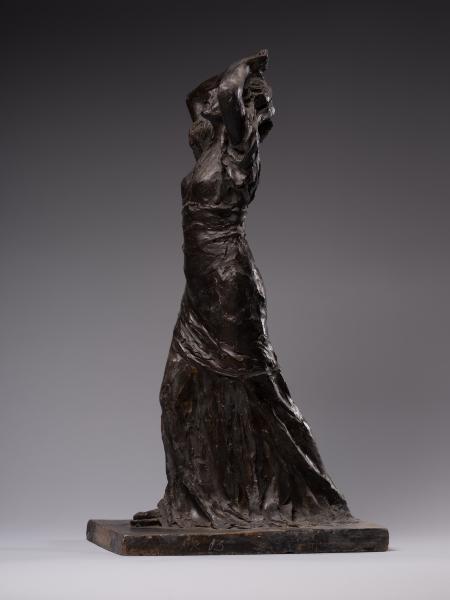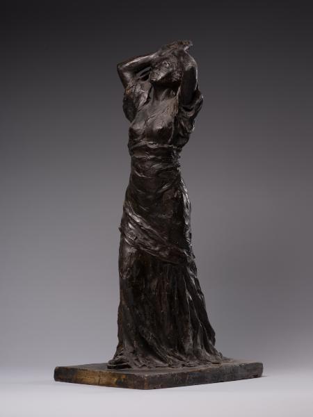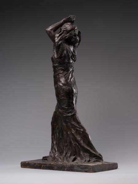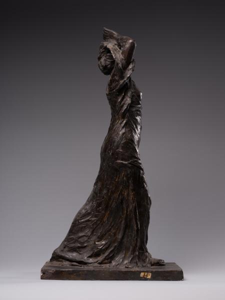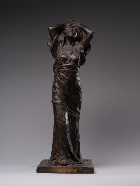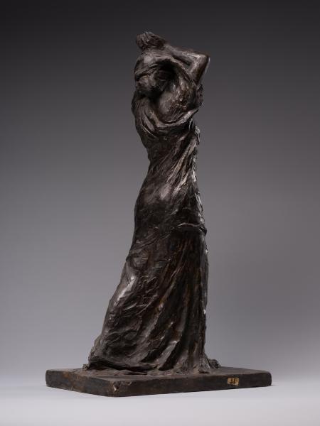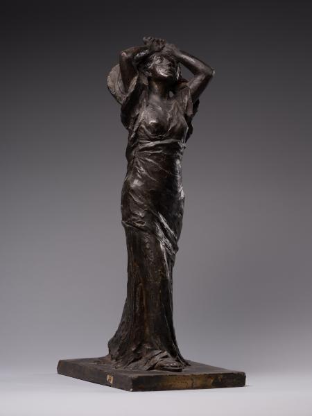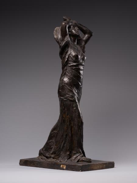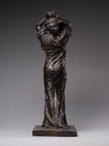 Luna Amalia Drexler's sculpture "Psyche" ("Wanda") or "Self-Exploration" combines the desire to visualise the subconscious, Secessionist elegance, symbolic mystery and Impressionist freedom of form characteristic of early 20th-century art. Appealing to the ancient Greek mythological image of Psyche (from the ancient Greek Ψυχή – "soul", "breath"), the author creates a multifaceted sculptural figure. Taking into account the connection between Psyche and Eros that has been established in the history of culture – from Posidippus, Meleager and the ancient Roman writer Lucius Apuleius to the English Romantic poet John Keats – one variation of the interpretation of the work is the self-knowledge of the soul in love. The double title of the sculpture reflects the understanding of the soul as a unity of sensations, mind, will, and imagination and its identification with cognition and self-knowledge, which is typical for ancient and Renaissance philosophical thought. One aspect of the artistic representation is an appeal to the Platonic concept of cognition as a passionate, sensual attraction of the soul to the world of "eidos". The figure is in keeping with the idea of the soul's unity with the eternal and absolute, as well as the identity of cognition of the world and self-knowledge established in the Romantic period. The transcendental aspects of the image, rooted in the understanding of the soul as a self-moving part of the eternal, are illustrated by the ascending dynamics of the woman's body with her arms behind her head and her face turned towards the sky. The image's openness to the outside world contributes to understanding self-knowledge as unity with the world: upward through the line of the arms, forward through the step, elliptically, in the back – through the garment's folds. The image of fulfilment in self-knowledge is created by the end of the modelling of volumes from the bottom up: from the flowing, sketchy, impressionistic drapery of the dress and the flexible torso to the perfect, beautiful face. The emotional genesis of the image, inherent in early twentieth-century sculpture, is reflected in the Secessionist fluidity of contours, the differentiated play of light and shadow and the relaxed modelling of forms. The work's affiliation with early twentieth-century art is evidenced by the dominance of purely plastic means of artistic expression, semantic ambiguity and openness to different readings.