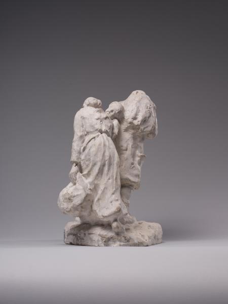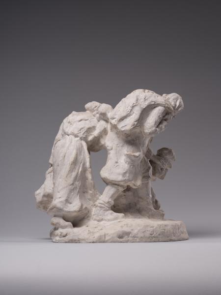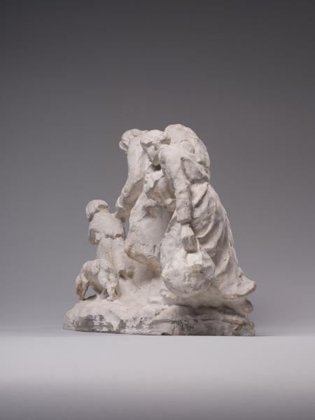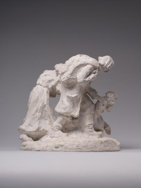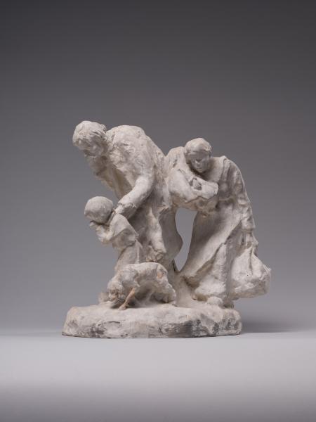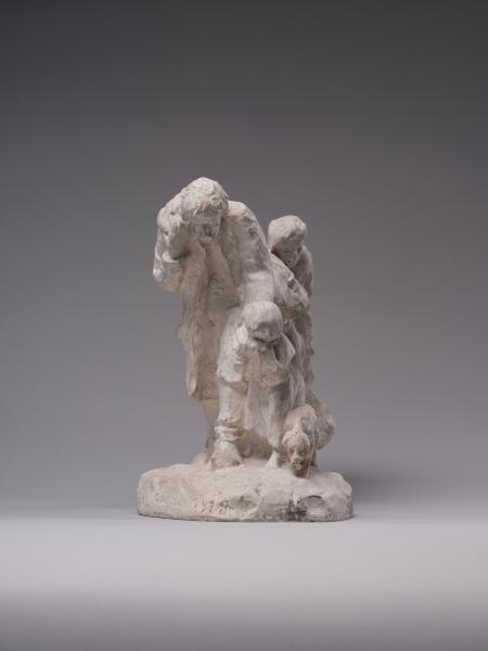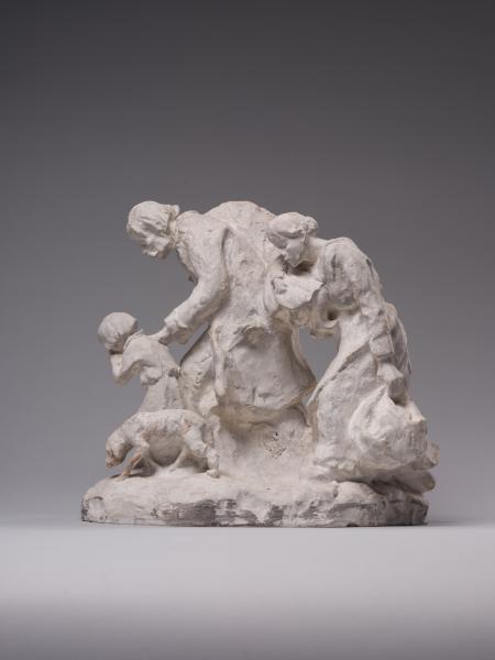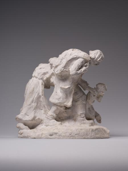 The action scenes embody the "realistic genre" tendencies in Julia Smolkowna's work, which received favourable reviews from art critics. For example, in the "Lvivska Gazeta" pages, V. Zhyla stated, "Smolkowna's small figures are very mobile as if they were constantly enveloped in air, surrounded by trembling, vibrating energy". In the opinion of S. Makhnievych, who reviewed the IV Lviv Artists' Exhibition in 1921, "Smolkowna is rooted in modern French sculpture (Rodin), has a lot of courage, scope, and a sense of volume". The "perfection of plasticity and movement" of the action groups created by J. Smolkowna was noted by J. Tomicka in her review of the VI Exhibition of the Association of Polish Women Artists in Lviv. One of J. Smolkowna's best works is the genre group "Evicted (Poverty)" (1918), in which pain, depression and unbearable life are reflected in depersonalised male, female and child figures, fused together and bent under the weight of misfortune. The sense of unconquerable adversity is reinforced by the movement from right to left, against the active horizontal, and by the monotonous, uniform rhythm. The dramatic nature of the image is emphasised by the repetition of the fate of the poor through the generations. The impression of the "closed circle of poverty", "poverty as a trap", is created by the hemispherical outline of the figures. The play of light and shadow on the protrusions of the vibrating surface and the active impressionistic modelling of the forms give the work a plastic expressiveness.