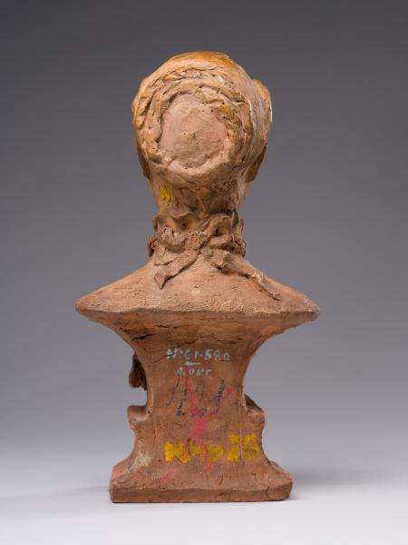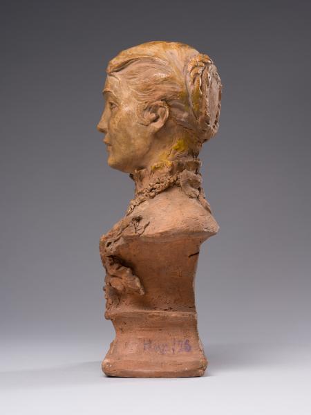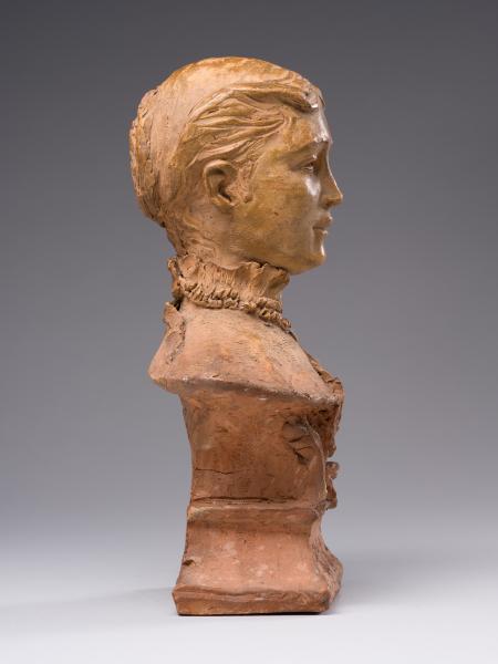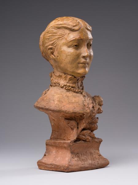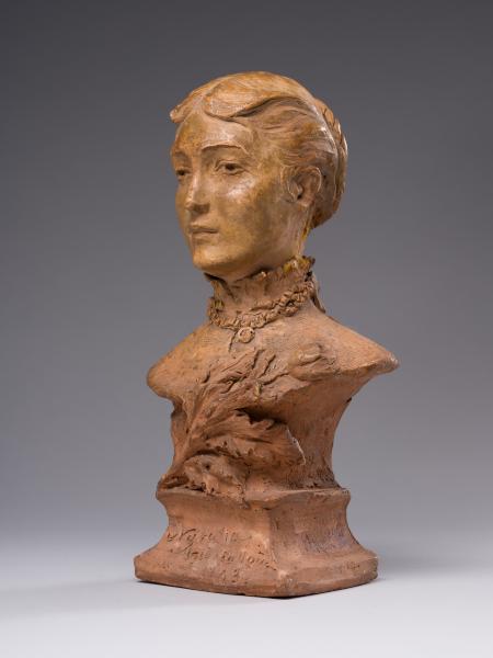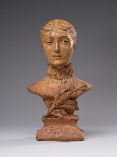 One of the most lyrical female portraits in Baracz's oeuvre is the bust of Natalia Andriollowa, born Tarnowska, a sculptor and artist, author of paintings, graphic, decorative and applied artworks, a student of W. Gerson in Warsaw, sculptors J. A. Injalbert, T. Noel and L. A. Roubaud. She was the wife of Michal Elwiro Andriolli (1836–1893), a representative of Romanticism, a graphic artist, and a famous illustrator of Polish and world literature. As in a number of other female portraits by T. Baracz from the 1890s, the means of artistic expression in this bust is a soft modelling of the face, expressed by graphic lines of the oval, hairstyle, eyebrows and eyelids. Thus, in the most plastically coherent frontal perspective, the model's dreamy, creative nature is reflected in her self-absorbed, thoughtful gaze, her shyness, the touching tenderness of her lips and her large, almond-shaped eyes. The decorative nature of the Lviv Secession is evident in the wavy strands of hair and the somewhat "salon-like" bouquet of flowers on the pedestal. At the same time, the profile and the three-quarter view reveal a plastic fragmentation that is absent in T. Baracz's later portraits from the early 1900s.