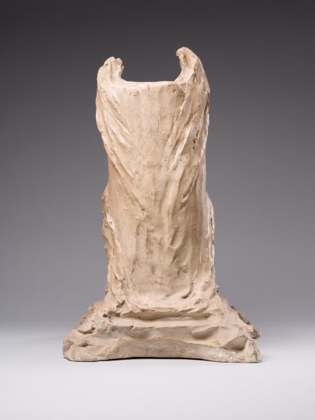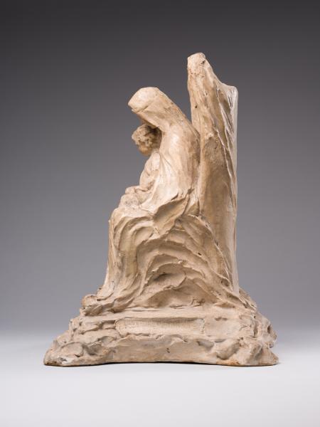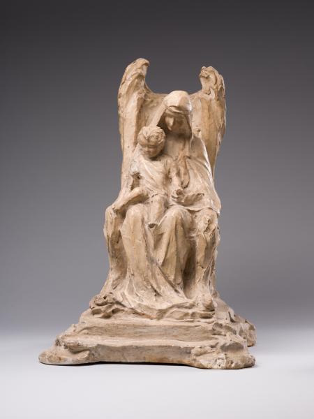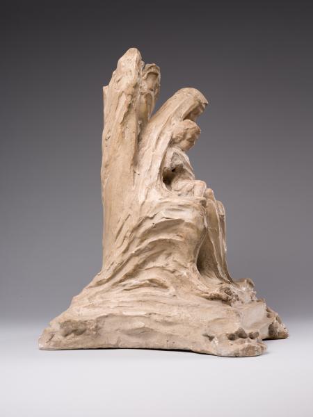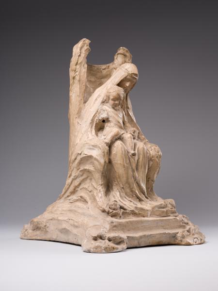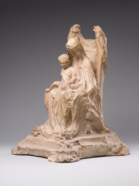 "The Virgin Mary and the Child" belongs to the mature period of Luna Amalia Drexler's work, when, under the influence of R. Schneider's anthroposophy, the artist turned away from Impressionism and Secessionism and plunged into the world of medieval culture in the unity of its meanings and forms. The result was an understanding of art as a mediator of spiritual meanings, a materialisation of the transcendent and an appeal to religious themes and subjects. Defined as "synthetic realism", the sculptor's new creative style was filled with metaphysics, Symbolism, and stylisations of Gothic and Renaissance art forms. The image of the Mother of God is interpreted in a number of the artist's works, including "The Virgin Mary and the Child", exhibited at the First Exhibition of Polish Artists in Lviv (1917), and "The Mother of God on the Throne" (1921–1924), installed in 1924 in the chapel of the Lviv Defenders' Cemetery. Combined with a creative interpretation of the traditional iconographic scheme of the Mother of God on the Throne, the compositions are perceived as an "image paradigm" of motherhood – a semantically multi-layered communicative artistic structure that "broadcasts" a differentiated set of meanings and appeals to the cultural experience of the viewer. In contrast to the majestically static, sublime "Madonna and the Child", the sculpture from the collection of Borys Voznytskyi Lviv National Art Gallery is characterised by less plastic integrity, active texture, differentiation of the figurative solution and artistic forms. Thus, the intricate outlines of the throne, the pedestal and the drapery reflect the decorative style of the Secession; the gently inclined beautiful female head has absorbed the harmony of antiquity and the Renaissance; and the image of the child has acquired domestic-genre features. The peculiarity of the work is the emphasis on Madonna's enlightened face, full of tenderness – a symbol of maternity that unites traditions, cultures, and times.