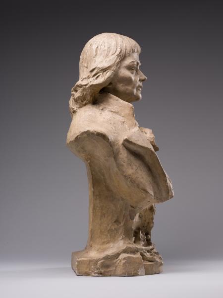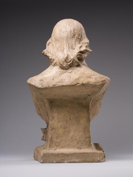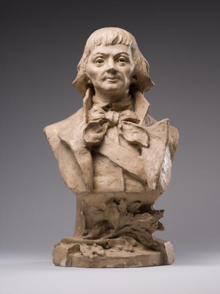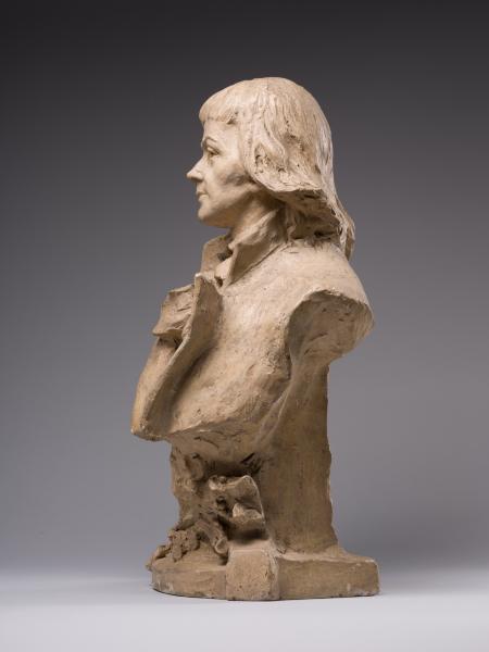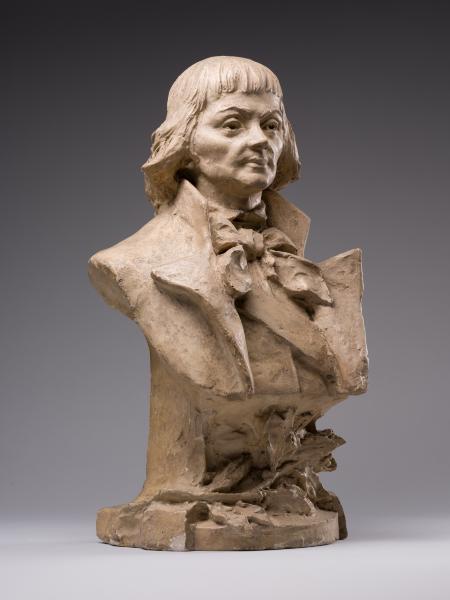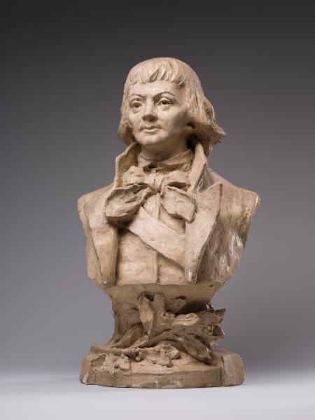 "Bust of Tadeusz Kosciuszko" (1893) is an example of the combination of Romanticism, neo-Baroque form, objectivity in reproducing details and individual features of the portrait in T. Baracz's work. Thus, one of the projects for a monument in Chicago to a military and political figure, a participant in the American War of Independence, the leader of the Polish Insurrection of 1794 and the generalissimo of the Polish-Lithuanian Commonwealth Army, visualises the concept of a national hero, a national messiah, and a rebellious and outstanding personality. The features of the project are the sublimity of the image, the plastic embodiment of the aesthetic categories of the majestic and the heroic, and the modelling of a "historical-epic chronotope" in which the subject of the portrait "stands before" the fatherland, the nation, the future, and the "addressee history". The openness of the face, the inclination of the head, and the distant gaze embody this idea. The heroic tone of the picture is contrasted by the careful modelling of the face, without idealisation, in the fullness of age-related features. The energetic modelling of volume, the slicked-back hair and the expressive folds of the elements of the sitter's costume are reminiscent of the neo-Baroque style. The image of a laurel branch, a symbol of immortality, triumph and victory, is in keeping with the traditions of representative portraiture. T. Baracz later turned to the artistic interpretation of Kosciuszko's image in an unrealised project of a monument for Lviv (1904) from the collection of Borys Voznytskyi Lviv National Art Gallery (inventory no. C-I-24).