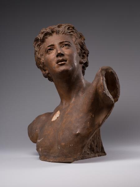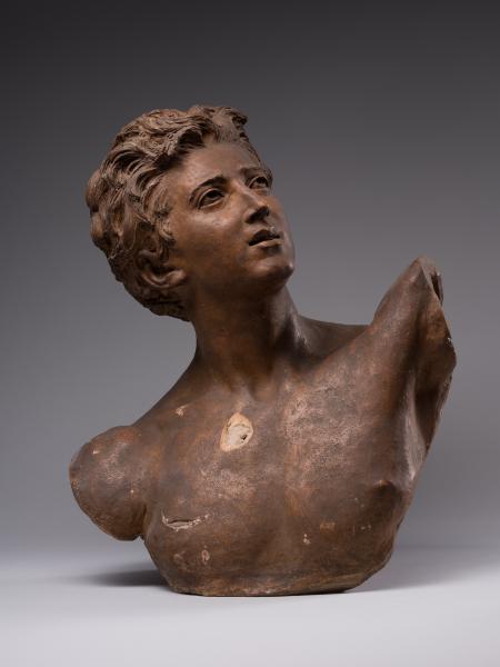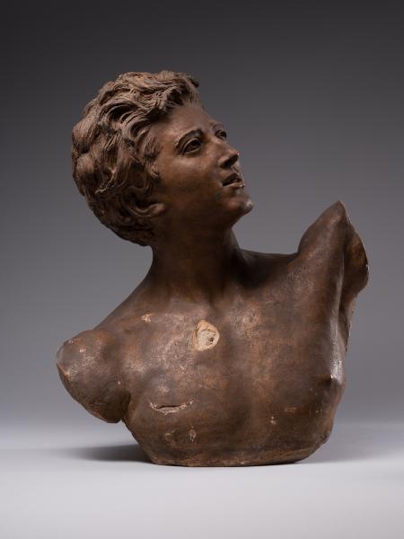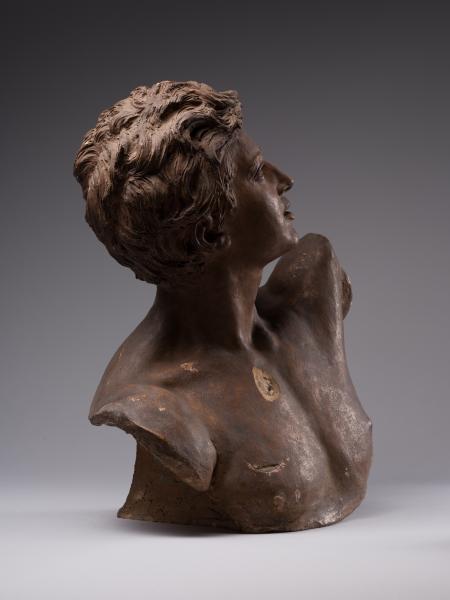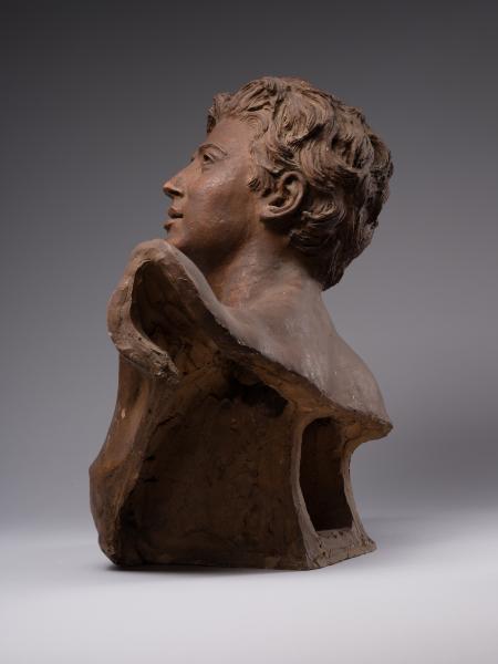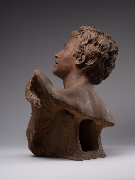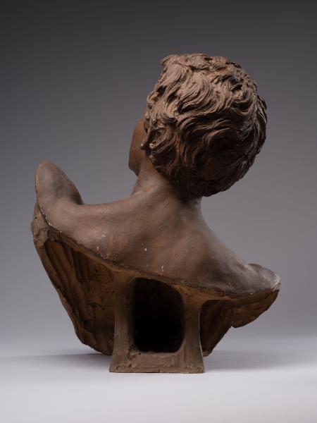 Tadeusz Baracz became famous as the author of numerous monuments, including those to Adam Mickiewicz in Drohobych (1894), Truskavets (1898), and Boryslav (1898), and a project for a monument to the poet in Krakow (1884–1885). The competition for the latter (1880–1890) was won by Teodor Rygier's work, which was later cast in Rome by the Italian firm Nelli and erected in 1898 on the square at the intersection of Sienna Street and Sukiennice. The monument was destroyed by the German occupying forces on 17 August 1940 and restored in 1955. T. Baracz's unrealised project was characterised by excessive narrative and an excess of figures, including the genius, whose terracotta model is in the collection of Borys Voznytskyi Lviv National Art Gallery, and the bronze model in the National Museum in Krakow. The sculptor's work on the monument comes at a time when the cult of Mickiewicz as a "national genius" of the Polish people, a "national prophet", was established in the late nineteenth century and several competitions for projects to mark the 100th anniversary of his birth were announced. The prototype of the sculpture was the numerous representations of geniuses as allegories of inspiration in the monuments to creative people in the European artistic tradition. Perhaps the most famous example of the implementation of the figurative and plastic concept in Lviv sculpture is the monument to A. Mickiewicz by A. Popiel (1902–1903) on the Mariinska Square in Lviv with the figure of the poet reaching for a lyre handed to him by a winged genius flying from the sky. The stylistic feature of the bust from the Gallery's collection is the reminiscence of Romanticism, visible in the inspired gaze and half-open young lips. The idealisation, the graceful line of the silhouette, the sensuality and the soft modelling all point to the inspiration of Neo-Florentine art, based on the creative reinterpretation of works by Donatello, Desiderio da Settignano, and Benvenuto Cellini.