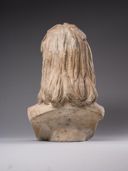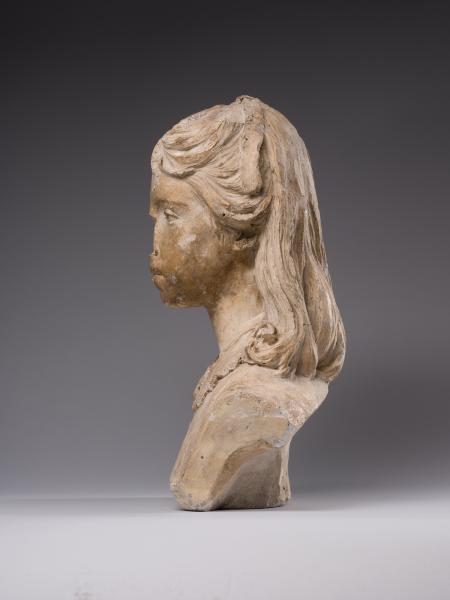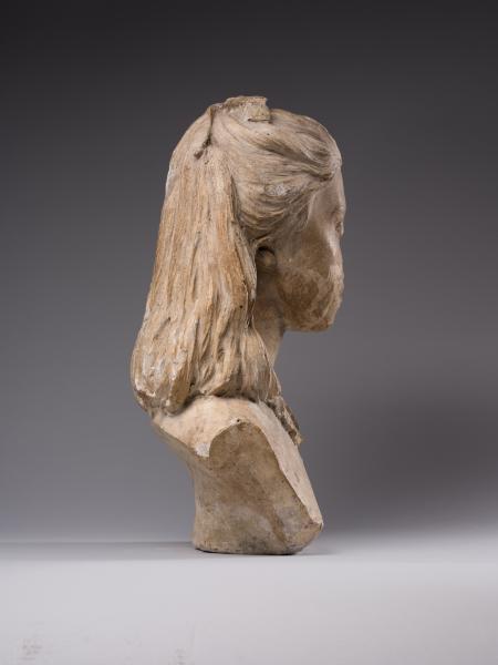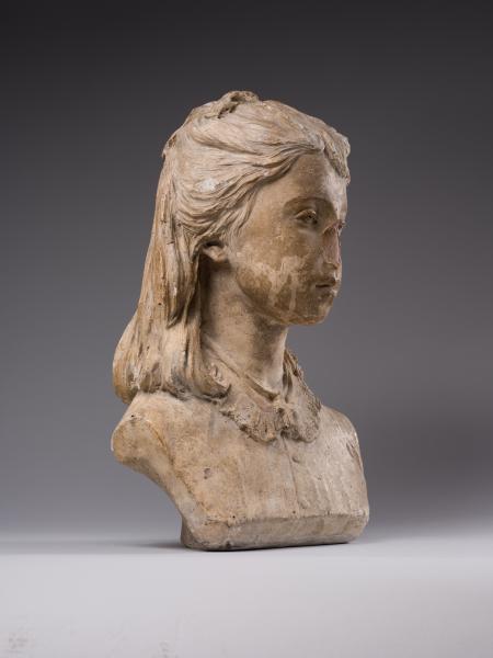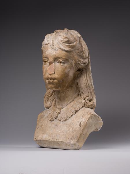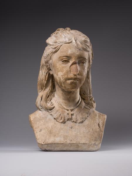 "Bust of Countess Siemienska" (c. 1900) is one of the numerous portraits of Lviv's social elite by T. Baracz, in which subtle psychologism and the reproduction of a momentary emotional state are combined with perfect academic drawing and classical clarity of forms. The carefully modelled face of the girl, with its full lips, small rounded chin, wide eyes and low forehead, is perceived as an echo of the Roman portrait tradition. The contrast between the softly modelled volume and the decoratively treated hair, the cross and the lace collar gives the portrait a plastic expressiveness. The nobility of the girl, who belonged to the old and noble Siemienski family of the Dibrova coat of arms, is emphasised by the subtle lyrical mood, refined lines, silhouette and forms.