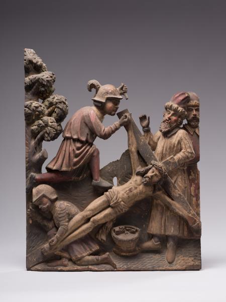 The Crucifixion of Christ is the execution of Jesus Christ by crucifixion on the cross. It is the episode that concludes the Passion of Christ and precedes the burial and resurrection of the Saviour. The composition shows the nailing to the cross. Organised along its diagonal, the image is characterised by narrative, psychology, and the careful modelling of figures and faces.