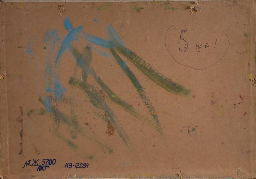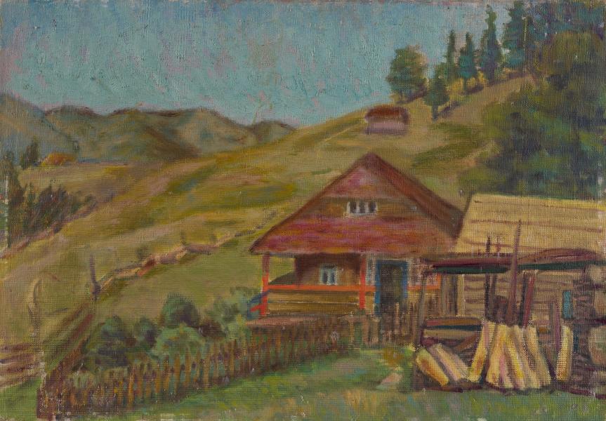 The landscape of the picturesque village of Dzembronia in the Ivano-Frankivsk region is marked by the mood and careful reproduction of a peasant's farmhouse against the background of a light blue, sun-bleached hot summer sky, hills, and fields. The peculiarity of the work is the skilful construction of the composition with a newly built house, a fence running down the slope, a barn, and a pile of firewood. The colouring of the work is based on a combination of cool sky blue, brown and ochre colours of the building, with subtle gradations of green-yellow and blue-green tones. The fact that the landscape was created in the second half of the 1940s and the first half of the 1950s is indicated by the forced adherence to mimetic principles inspired by external circumstances, unlike the artist's modernist works of the 1920s and 1930s.
