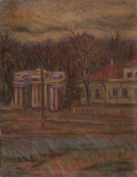 Turyn's landscape "On the Outskirts of the City" is characterised by a combination of mimetic principles and the experience of the Kapists, with its inherent reflection of reality in gradations of vibrant colour. The likelihood of Kapists inspiration is confirmed by Turyn's studies under Jozef Pankiewicz, the prime mover of the KP group, and the artist's trip to Paris with its members in the mid-1920s. The work is thus related to the aesthetics of the Kapists through the understanding of a natural motif as a pretext for the construction of chromatic harmony and the emphasis on the quality of the painting material and the surface of the picture, which is covered with myriads of elongated, trembling strokes. The peculiarity of the canvas is the depiction of an autumnal landscape shrouded in mist through the "evocation" of white-grey, green and blue tones from the dominant grey-pink. The composition's horizontal structure, the orientation of the buildings, the horizon, and the leafless trees along the river are striking.
