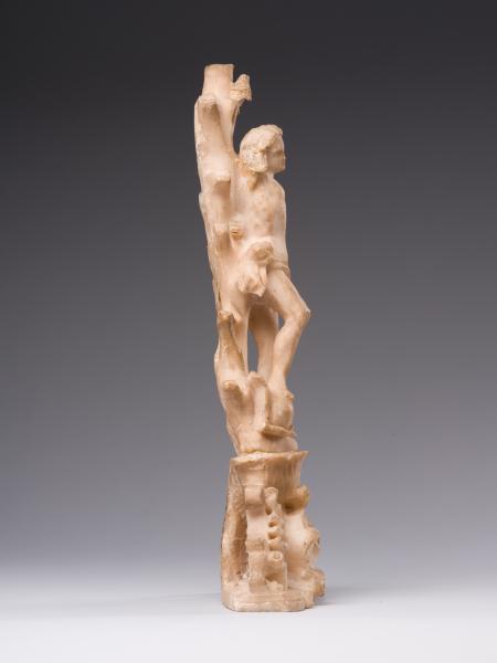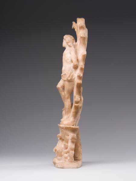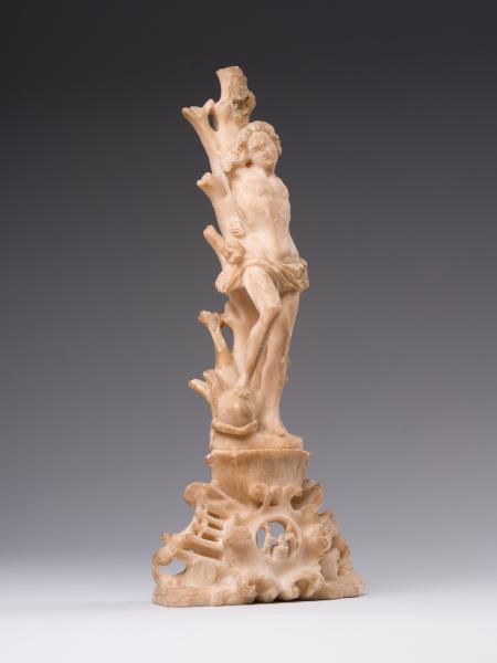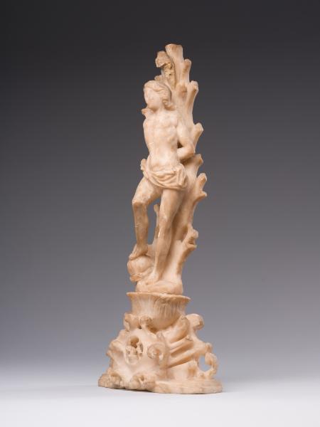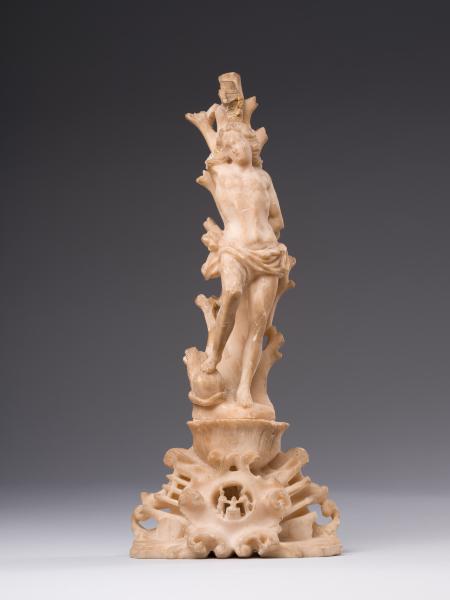 Sebastian of Narbonne, also known as Sebastian of Mediolanus, was a Roman Christian saint and martyr. Born in Narbonne (Gaul), he was educated and lived in Mediolanus (Milan). Under the co-emperors Diocletian and Maximian (284–305), he held the position of head of the court guard. He was a secret Christian and helped his fellow believers. Sebastian's commitment to Christianity became known during the execution of two of his friends, Mark and Marcellian, whom he publicly persuaded to remain faithful. Sebastian was personally interrogated by Emperor Diocletian, who ordered the martyr to be taken outside the city, tied to a tree and shot with arrows. The wife of the official Castulus, Irene, came at night to bury the saint but found him alive and took him home. Sebastian was healed of his wounds. The Christians begged him to leave Rome, but he refused. While near a pagan temple, the saint saw the emperors going there and publicly accused them of dishonour. Diocletian ordered Sebastian to be taken to the Hippodrome, where he was killed and his body thrown into the Cloaca Maxima, a sewer leading into the Tiber. The holy martyr appeared in a dream to a Christian woman, Lucina, and told her to take the body and bury it in the catacombs. The Basilica of St. Sebastian was built over the saint's tomb. In a work from the collection of Borys Voznytskyi Lviv National Art Gallery, the saint is shown tied to a tree before being executed by arrows from bows. The whimsicality of the contours, the ornamental decoration of the pedestal and the saint's pose show Rococo influences.