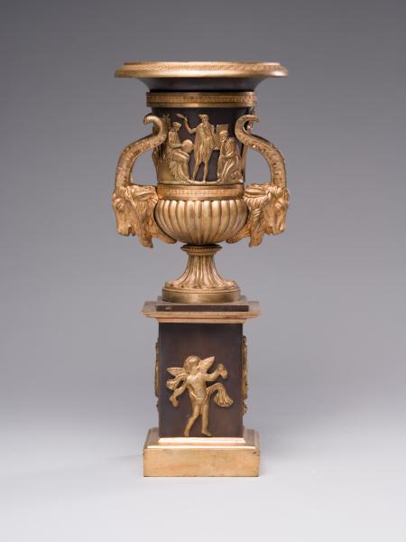 The appeal to antiquity is a characteristic feature of the Renaissance, Classicism, Baroque, and the 18th and 19th centuries culture. Along with architecture, sculpture and painting, reminiscences of antiquity entered the decorative and applied arts at the level of plasticity, proportions and decoration. An example of this is a vase from the Gallery's collection with the characteristic features of the Empire style – lavish decoration, contrast of gold and black bronze, and architectural forms. A golden lyre, an Apollonian attribute, shines against the dark background of the base. The laurel wreath reminds us of Apollo, the god of sciences and arts, peace, victory and triumph. Eagles' heads and an antique helmet symbolise courage, victory and strength. The decorative function is fulfilled by the erots that rhythmically line the surface. The vase's silhouette is formed by massive ears in the shape of golden goat heads, which in heraldic compositions symbolise hard work, unwavering strength, kindness and peacefulness. The figurative composition of male and female figures in ancient garments contrasts the vertical architecture, classically balanced by an undulating horizontal rhythm. Semantically, the images are related to education and refer to the Greek concepts of "paideia" – the cultivation of human nature, which is integral to cultural genesis; "arete" – discipline, virtue, courage; and "kalokagathos" – the unity of inner and outer beauty.