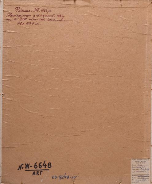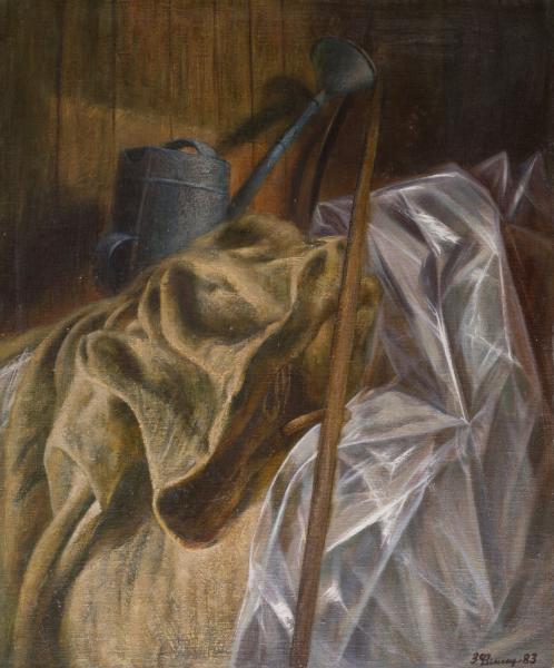 An essential component of Z. Flinta's creative work is still lifes, where the world of things is transformed into symbols and allegories – expressions of the meanings of life. Thus, in "Still Life with Cellophane", the master reflects the opposition of man-made and natural, modern industrial civilisation and everyday life of the Ukrainian village through the medium of everyday objects. Thus, the folk life is marked by a watering can, a row of clothes, and a natural wooden wall background. The sign of the artificial, synthetic, "unnatural" is transparent cellophane. The semantic opposition is reproduced in colour, contrasting warm brown-ochre and cold white-silver-grey tones. Formative experiments are an important aspect of the work, and they are visible in the Cubist destruction of draperies into many geometric planes. The perception of a still life as a field of formal Cubist experiments can be found in other works of the artist ("Drapery", 1974; "Oilcloth", 1983).