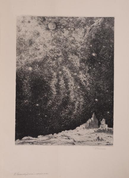 The work depicts a cosmic landscape. Most of the page is taken up by an image of the night sky with a chaotic cluster of stars, stripes, and the moon in the upper left. At the bottom right are the outlines of sharp rocks or Gothic buildings.