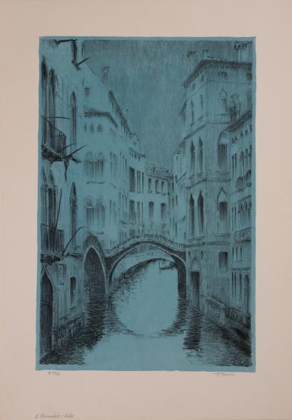 The author has recreated the landscape of Venice. The blue engraving shows a canal in the centre, with rows of Renaissance buildings on either side. Several bridges over the canal and a fragment of a gondola can be seen in the distance.